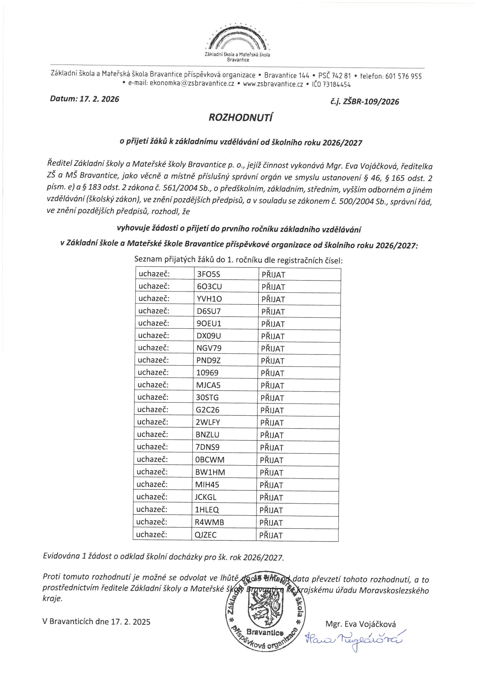 ROZHODNUTÍ o přijetí žáků k základnímu vzdělávání od školního roku 2026/2027